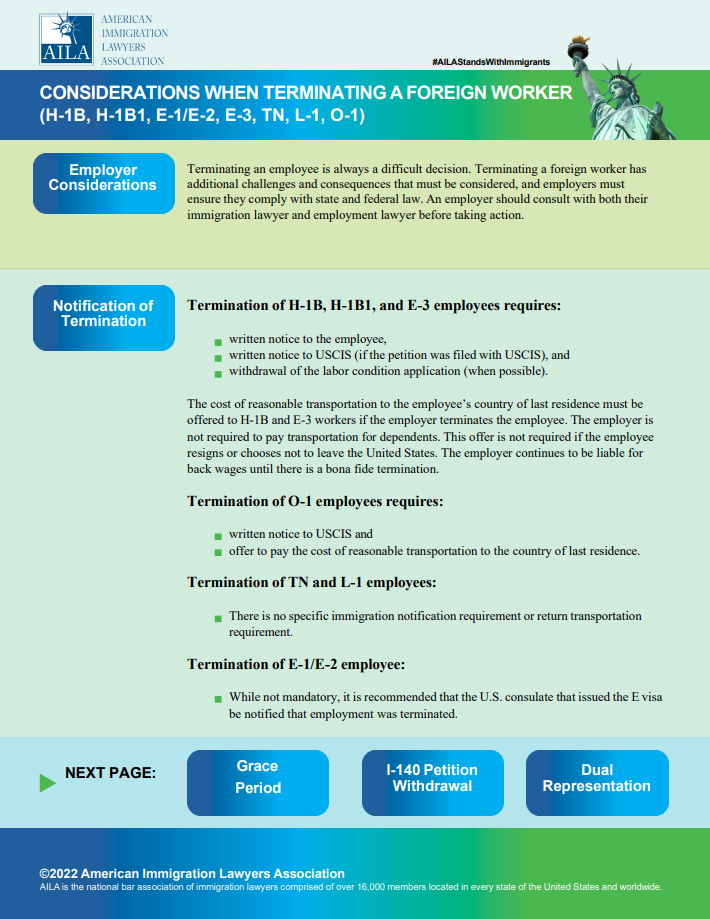 There’s many considerations an employer should consider before terminating a foreign worker in various visa statuses. This American Immigration Lawyers Association flyer outlines some of the information and steps a company will need to take when terminating H-1B, H-1B1, E-1/E-2, E-3, TN, L-1, and O-1 employees.